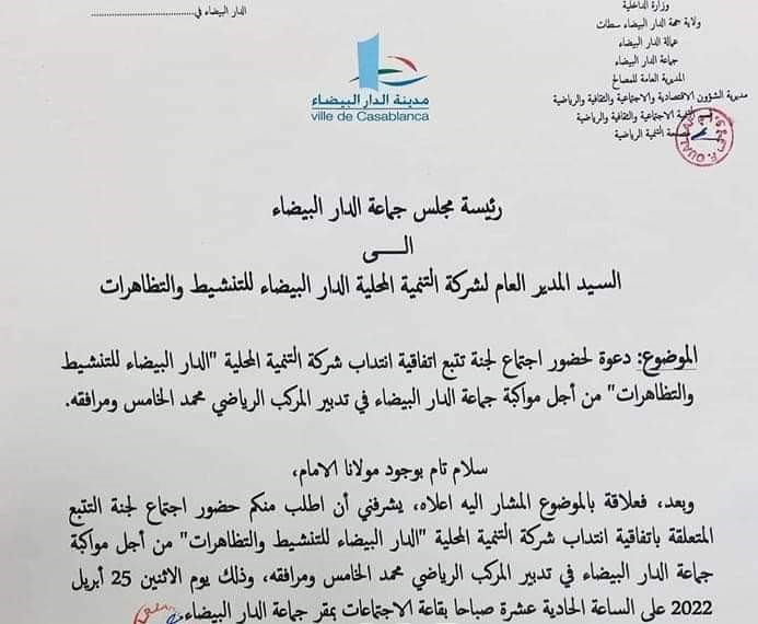 وطلبت رئيسة مجلس الدار البيضاء -في المراسلة الموقعة بالنيابة من طرف النائب التاسع عبد اللطيف الناصري- حضور اجتماع لجنة التتبع المتعلقة باتفاقية انتداب شركة التنمية المحلية “كازا إيفنت”، من أجل مواكبة جماعة الدار البيضاء في تدبير المركب الرياضي محمد الخامس ومرافقه، وذلك يوم غد الاثنين 25 أبريل 2022.