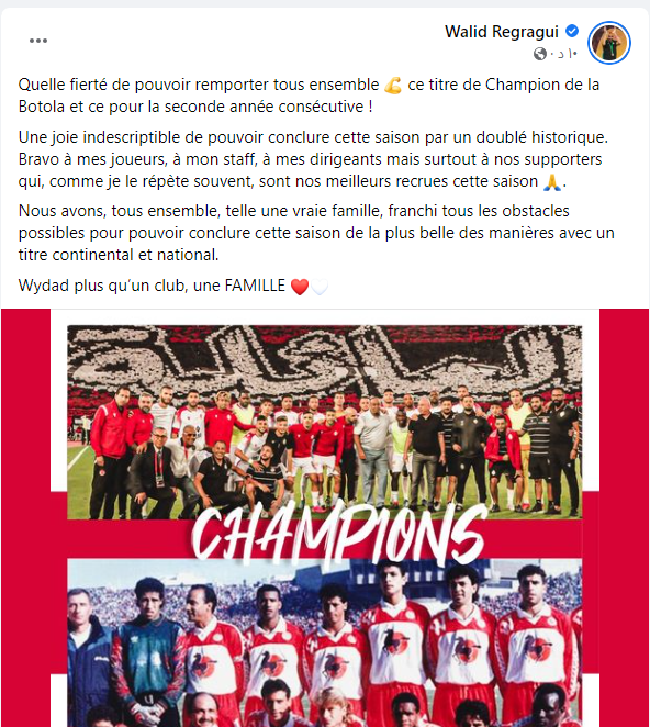 فيما نشر وليد الركراكي على صفحته الرسمية على “فيسبوك” كتب فيها “يا له من فخر أن تكون قادرا على الفوز معا – هذا لقب بطل البطولة للعام الثاني على التوالي!